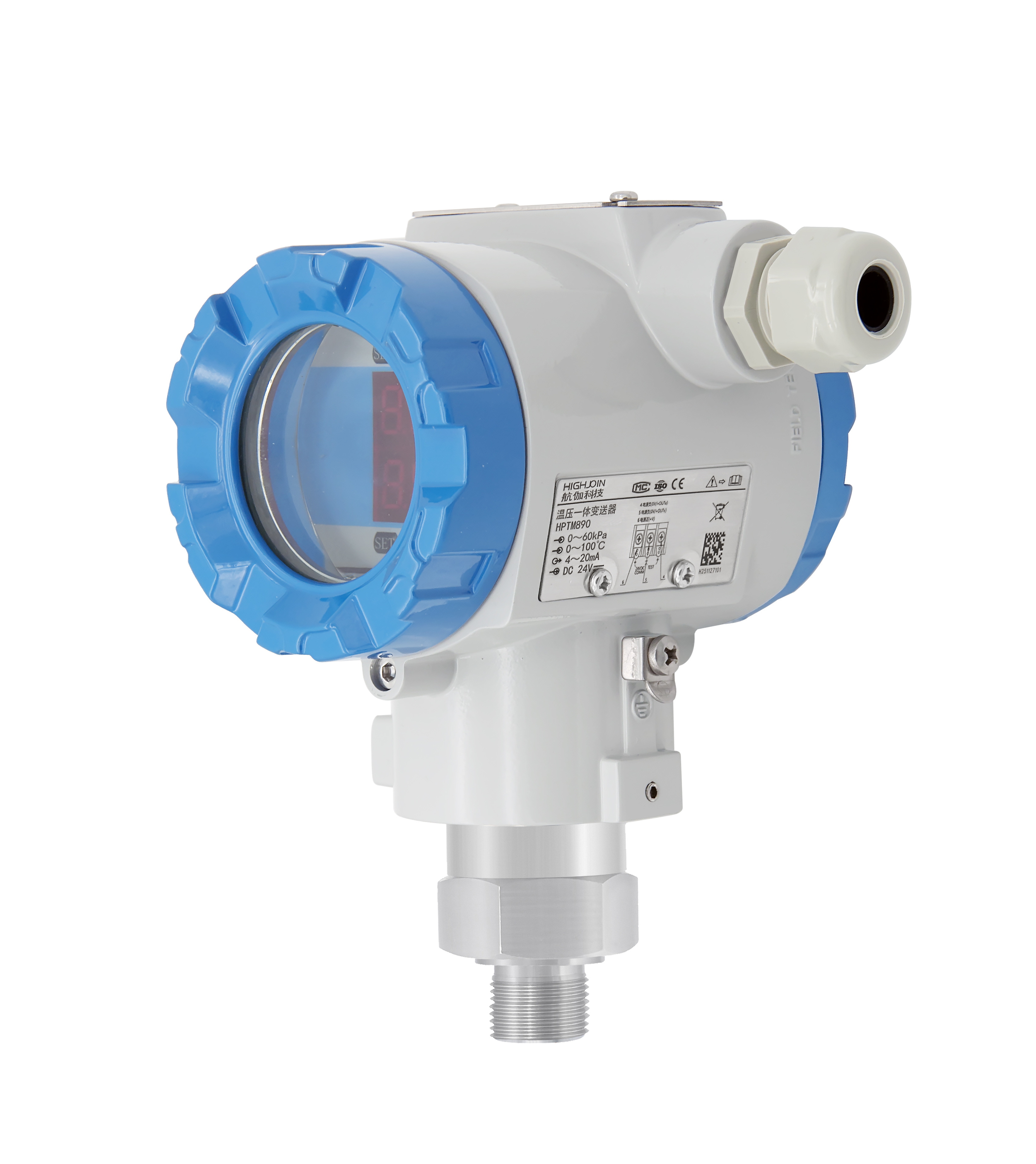 Преобразователь температуры и давления с цифровым дисплеем HPTM890 объединяет высокостабильный чувствительный к давлению элемент и высокоточный термочувствительный элемент для независимых измерений, что позволяет одновременно и точно измерять давление и температуру среды. Он может выводить два стандартных сигнала 4–20 мА. Кроме того, этот продукт оснащен 4-значным двухрядным светодиодным полевым дисплеем, который может одновременно отображать значения давления и температуры.